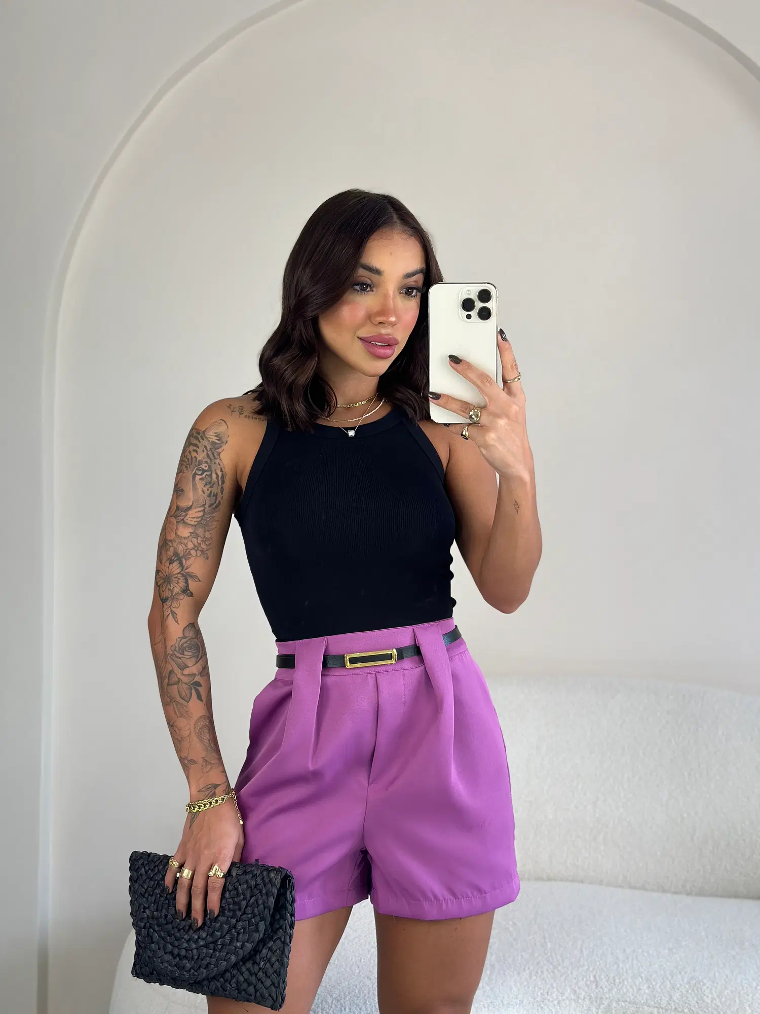 Além disso, o shorts possui detalhes em pregas na parte frontal, que dão um toque de sofisticação à peça. E para completar o look, o conjunto acompanha um cinto, que pode ser usado tanto com o shorts quanto com outras peças do seu guarda-roupa.